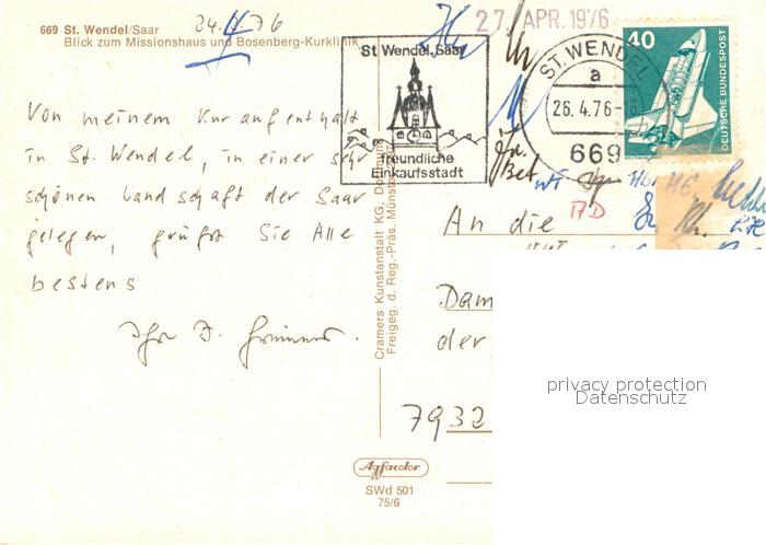 73656153 alte Postkarte St Wendel Fliegeraufnahme mit Missionshaus und Bosenberg Kurklinik postalisch gelaufen Erhaltung siehe scans [WerneD78] KatCode: 11110010046117