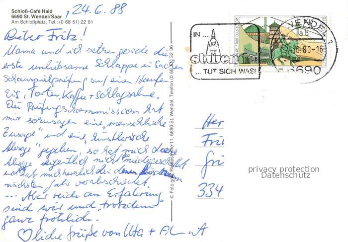 74020855 alte Postkarte St Wendel Saarland Schloss Café Haid Strassencafé Brunnen postalisch gelaufen Erhaltung siehe scans [FriedD77] KatCode: 11110010046117