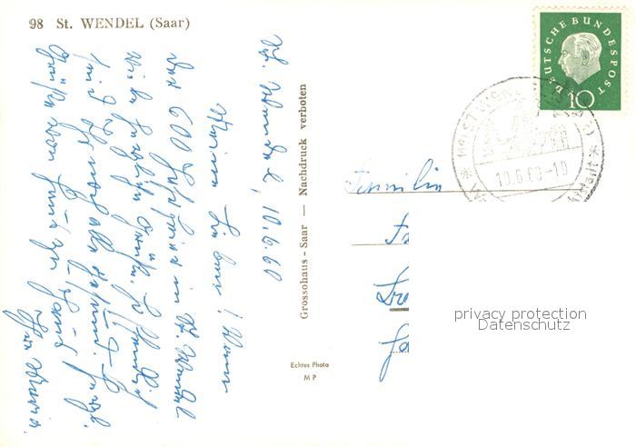 73155880 alte Postkarte St Wendel Teilansichten Strassenpartie Kirche Bach Statue postalisch gelaufen Erhaltung siehe scans [FriedD77] KatCode: 11110010046117