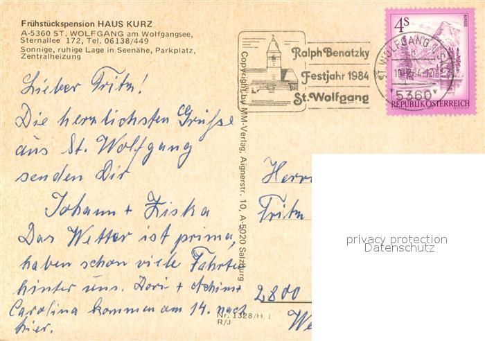 73642994 alte Postkarte St Wolfgang Salzkammergut Pension Haus Kurz am Wolfgangsee postalisch gelaufen Erhaltung siehe scans [FriedD77] KatCode: 11390315040717