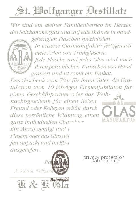73224233 St Wolfgang Salzkammergut St Wolfganger Destillate Benediktiner Schnaps Manufaktur Glasmanufaktur postalisch nicht gelaufen Werbekarte (keine Postkarte) Erhaltung siehe scans [FriedD77] KatCode: 11390315040717