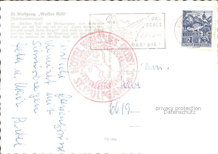 71899893 alte Postkarte St Wolfgang Wolfgangsee Hotel Restaurant Weisses Roessl Kirche Segelboot Wolfgangsee postalisch gelaufen Erhaltung siehe scans KatCode: 11390315040717