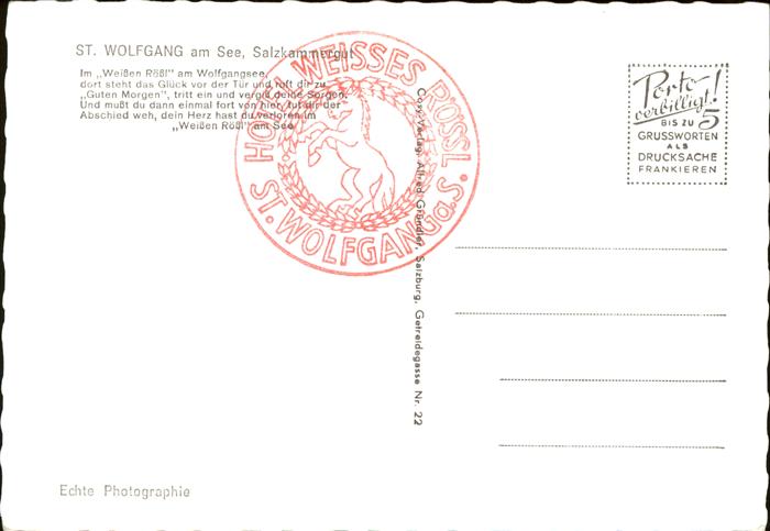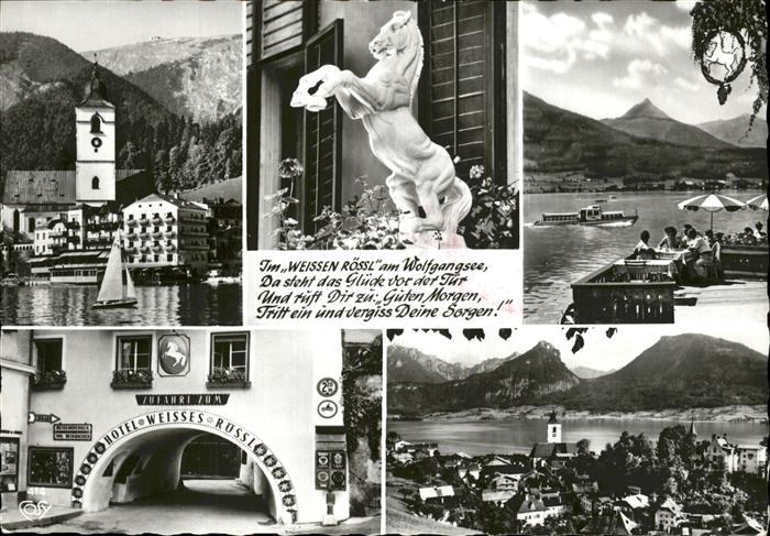 71475666 St Wolfgang Wolfgangsee Hotel Weisses Roessl Terrasse Kirche Gedicht Panorama Wolfgangsee Alpenblick postalisch nicht gelaufen Erhaltung siehe scans KatCode: 11390315040717