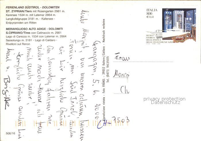 old postcard St Zyprian Panorama mit Rosengarten Dolomiten Karersee Latemar Langkofelgruppe Erdpyramiden am Ritten postalisch gelaufen Erhaltung siehe scans [FriedD77]