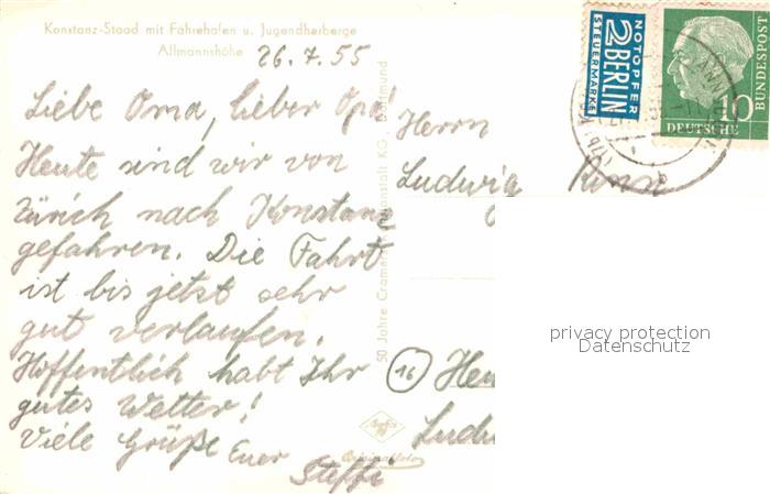 72919923 alte Postkarte Staad Konstanz Fliegeraufnahme mit Faehrhafen und Jugendherberge postalisch gelaufen Erhaltung siehe scans [WerneD78] KatCode: 11110008335043