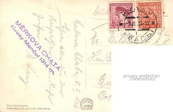 old postcard Stachy Susice Okres Pachatice Sesul nad Merkovou Chatou postalisch gelaufen Erhaltung siehe scans [FriedD77]