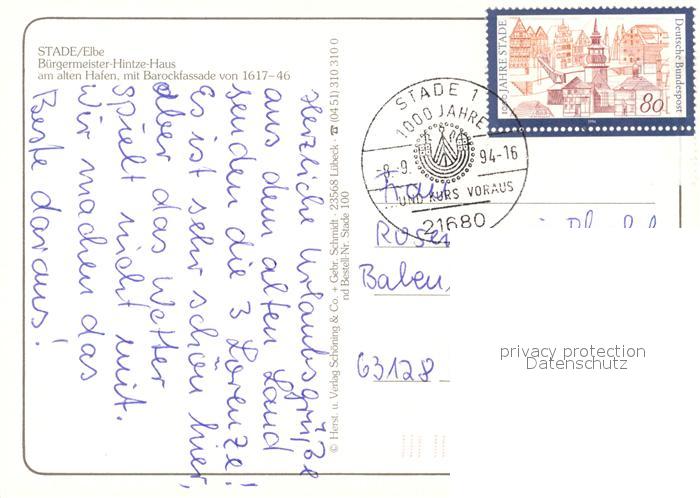 73226805 alte Postkarte Stade Niederelbe Buergermeister-Hintze-Haus am alten Hafen Barockfassade postalisch gelaufen Erhaltung siehe scans [LiesaD40] KatCode: 11110003359038