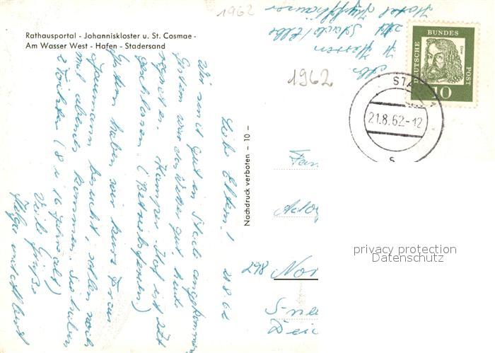 73054556 alte Postkarte Stade Niederelbe Rathausportal Johanniskloster Sankt Cosmae Hafen Stadersand postalisch gelaufen Erhaltung siehe scans [KathaD81] KatCode: 11110003359038
