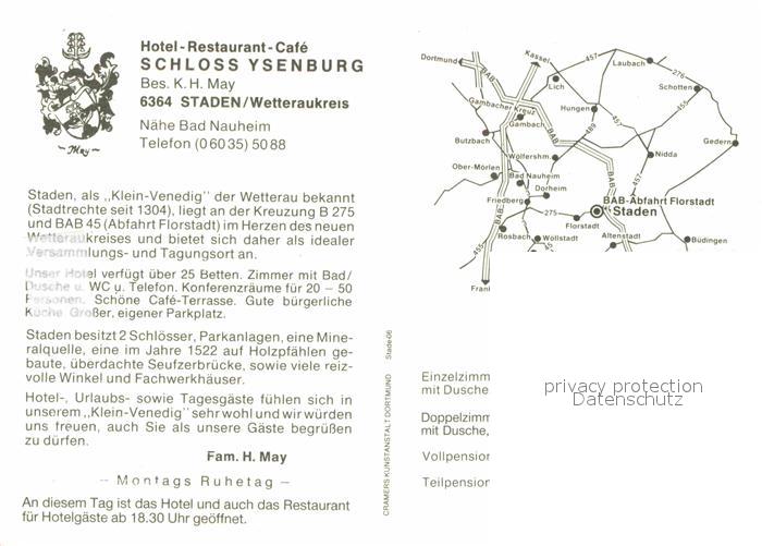 72800964 Staden Hessen Hotel Restaurant Cafe Schloss Ysenburg postalisch nicht gelaufen Werbekarte (keine Postkarte) Erhaltung siehe scans [FriedD77] KatCode: 11110006440007