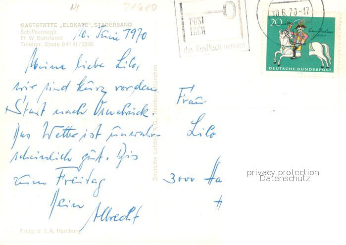 73643234 alte Postkarte Stadersand Gaststaette Elbkate Fliegeraufnahme postalisch gelaufen Erhaltung siehe scans [WerneD78] KatCode: 11110003359038