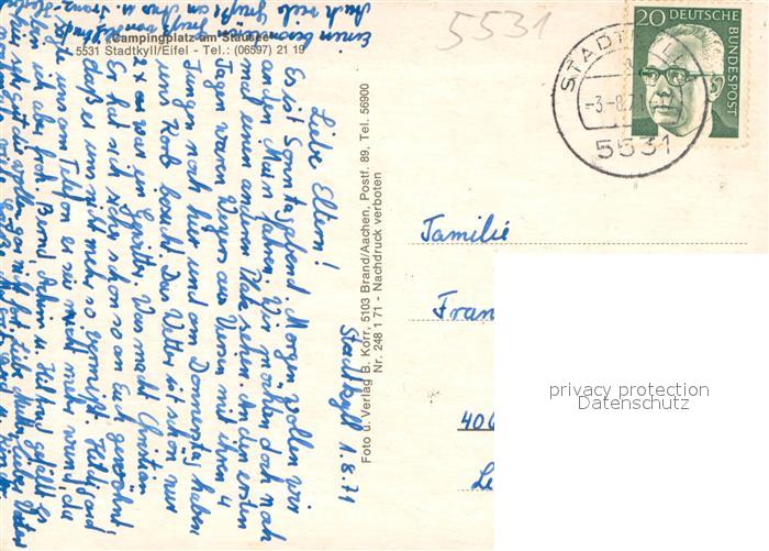 73747012 alte Postkarte Stadtkyll Campingplatz m. Schwimmbad postalisch gelaufen Erhaltung siehe scans [LiesaD40] KatCode: 11110007233240