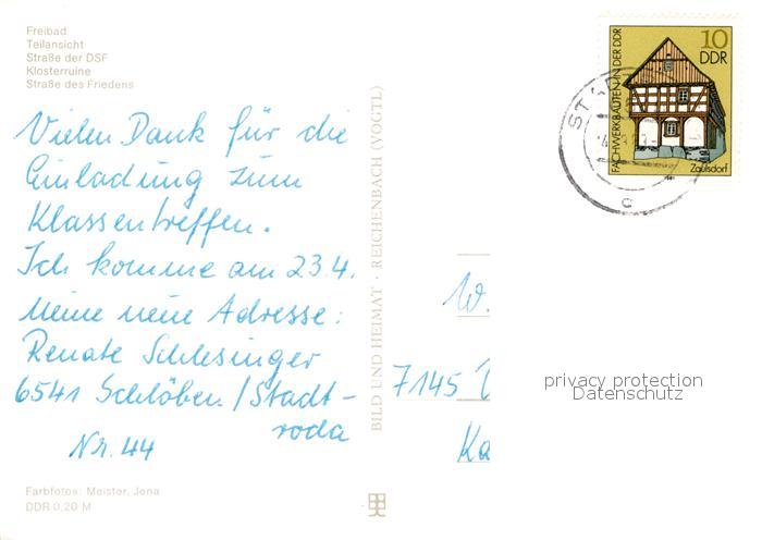 72985158 alte Postkarte Stadtroda Freibad Klosterruine Strasse des Friedens postalisch gelaufen Erhaltung siehe scans [LiesaD40] KatCode: 11110016074094