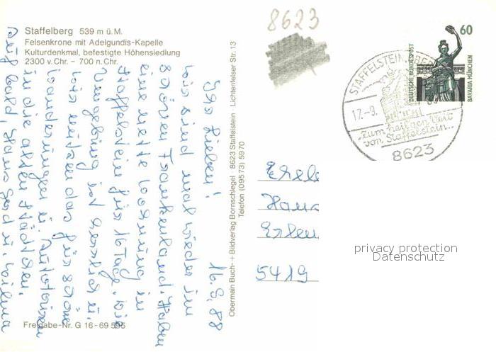 72880145 alte Postkarte Staffelberg Felsenkrone mit Adelgundis Kapelle Kulturdenkmal Hoehensiedlung Fliegeraufnahme postalisch gelaufen Erhaltung siehe scans [FriedD77] KatCode: 11110009478165