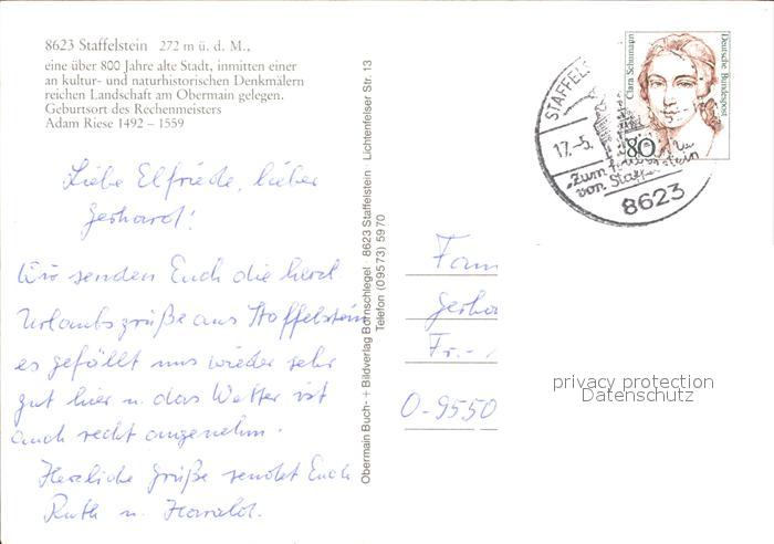 72373527 alte Postkarte Staffelstein Adam Riese Geburtsort Schloss Schwimmbad postalisch gelaufen Erhaltung siehe scans KatCode: 11110009478165