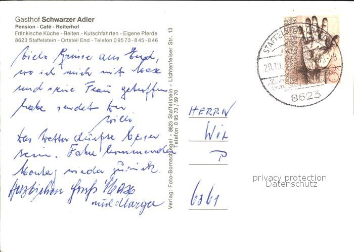72531943 alte Postkarte Staffelstein Bad Gasthaus Schwarzer Adler postalisch gelaufen Erhaltung siehe scans [LiesaD40 kt094box] KatCode: 11110009478165