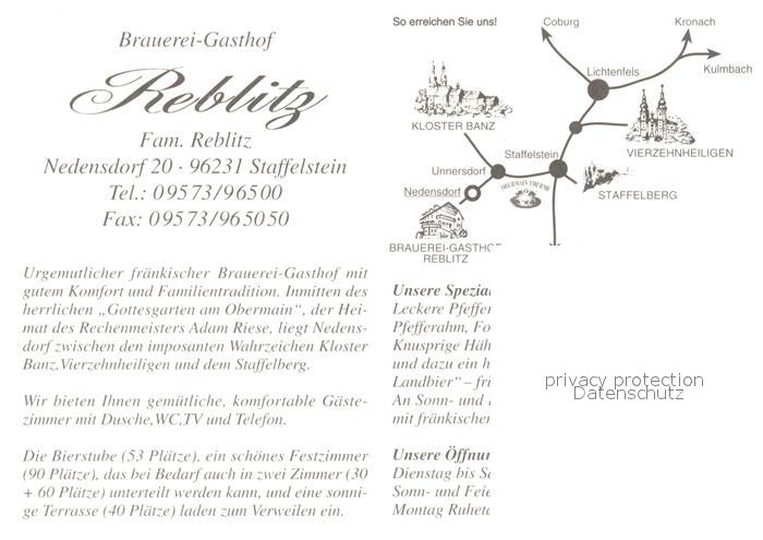73543073 Staffelstein Brauerei Gasthof Reblitz postalisch nicht gelaufen Werbekarte (keine Postkarte) Erhaltung siehe scans [FriedD77] KatCode: 11110009478165
