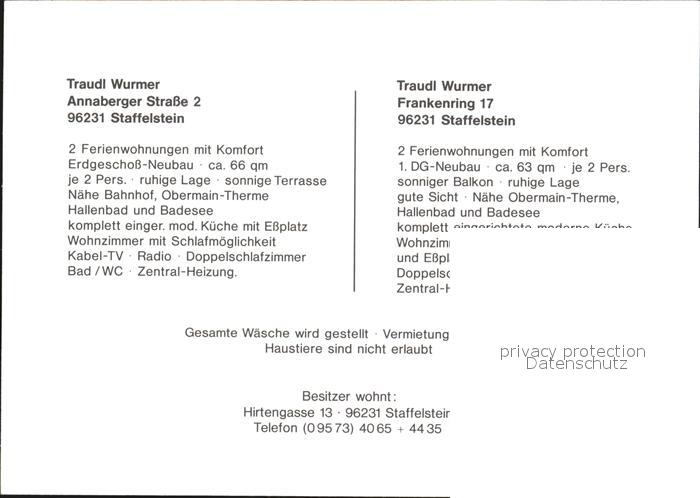 Staffelstein Ferienwohnungen Traudl Wurmer postalisch nicht gelaufen Werbekarte (keine Postkarte) Erhaltung siehe scans