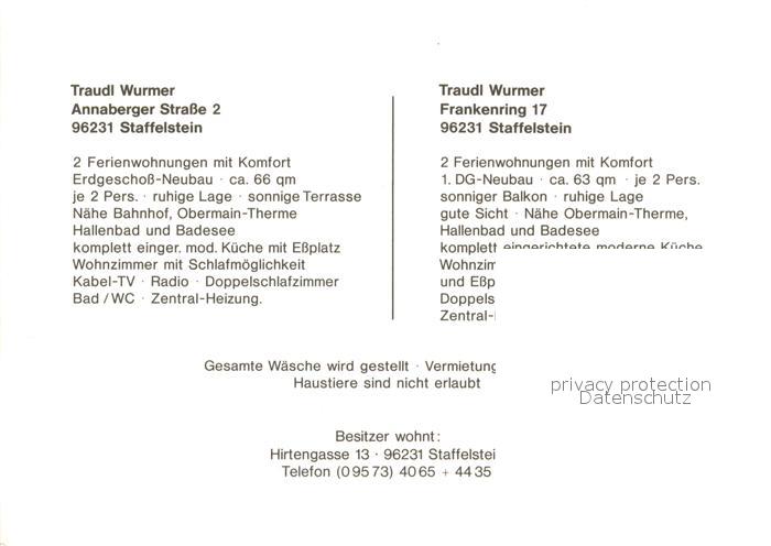 73653613 Staffelstein Ferienwohnungen Traudl Wurmer postalisch nicht gelaufen Werbekarte (keine Postkarte) Erhaltung siehe scans [FriedD77] KatCode: 11110009478165