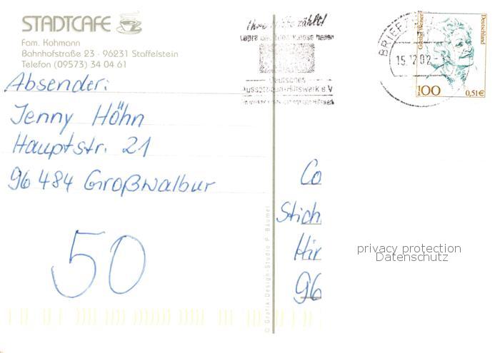 73834097 alte Postkarte Staffelstein StadtCafe postalisch gelaufen Erhaltung siehe scans [FriedD77] KatCode: 11110009478165