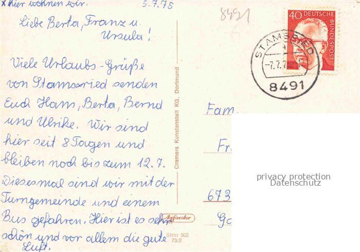 74049751 alte Postkarte Stamsried Cham Bayern Panorama Kirche Brunnen Burgruine postalisch gelaufen Erhaltung siehe scans [FriedD77] KatCode: 11110009372161