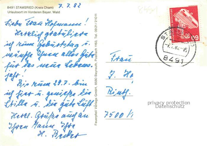 74049715 alte Postkarte Stamsried Cham Bayern Panorama Urlaubsort Bayerischer Wald Stadtplatz Kirche Burgruine postalisch gelaufen Erhaltung siehe scans [FriedD77] KatCode: 11110009372161
