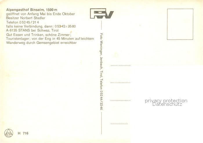 73049277 Stans Tirol Alpengasthof Binsalm postalisch nicht gelaufen Erhaltung siehe scans [KathaD81] KatCode: 11390335070928