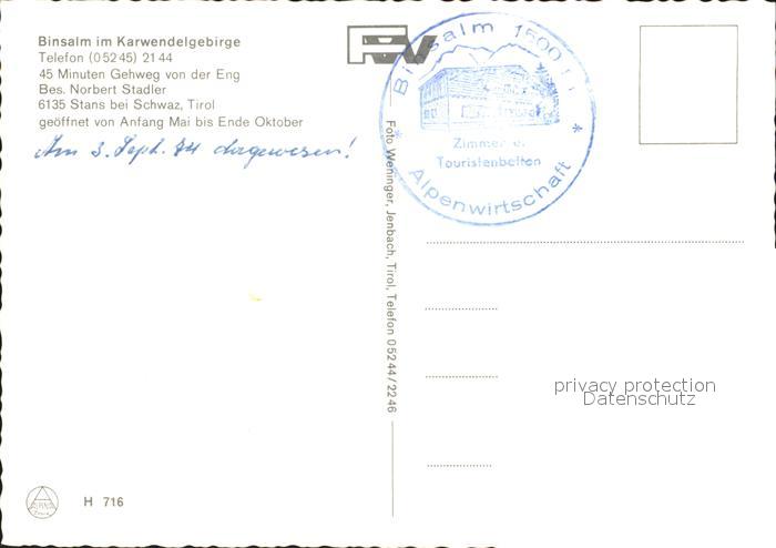 42924073 Stans Tirol Binsalm im Karwendelgebirge postalisch nicht gelaufen Erhaltung siehe scans [WerneD48] KatCode: 11390335070928