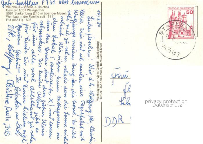 73782561 alte Postkarte Starkenburg Weinhaus-Schoene Aussicht m. Mosel postalisch gelaufen Erhaltung siehe scans [LiesaD40] KatCode: 11110007231120
