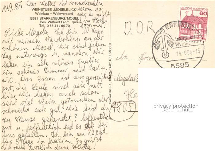 73648133 alte Postkarte Starkenburg Weinstube Moselblick Terrasse Blick ins Moseltal postalisch gelaufen Erhaltung siehe scans [FriedD77] KatCode: 11110007231120