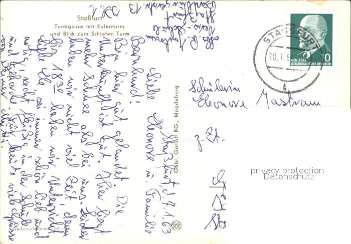 72048792 alte Postkarte Stassfurt Turmgasse mit Eulenturm und Schiefem Turm postalisch gelaufen Erhaltung siehe scans KatCode: 11110015089310