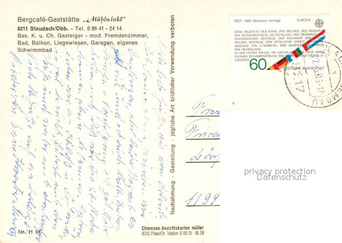 73717244 alte Postkarte Staudach Oberbayern Bergcafe Gaststaette Muehlwinkl Freibad Panorama Hochgern Gastraum postalisch gelaufen Erhaltung siehe scans [WerneD78] KatCode: 11110009189146