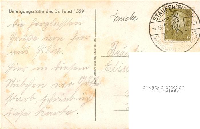 33117845 alte Postkarte Staufen Breisgau Fauststube Gasthaus zum Loewen postalisch gelaufen Erhaltung siehe scans [PaolaD17] KatCode: 11110008315108