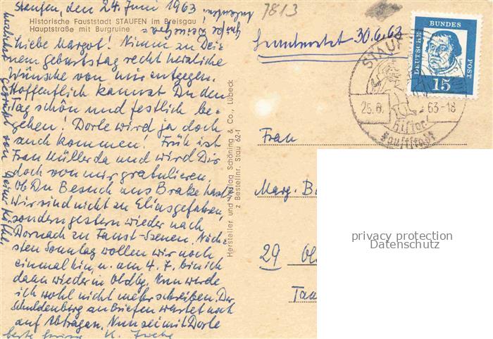 34144783 alte Postkarte Staufen Breisgau Hauptstrasse mit Burgruine postalisch gelaufen Erhaltung siehe scans [FriedD77] KatCode: 11110008315108
