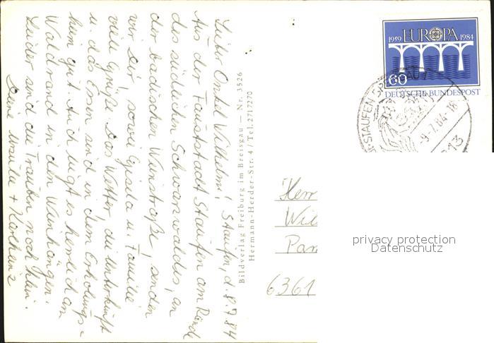 72530839 alte Postkarte Staufen Breisgau Haus Muenstertal Schloss Stadtsee und Burg Hallenbad postalisch gelaufen Erhaltung siehe scans [LiesaD40 kt094box] KatCode: 11110008315108