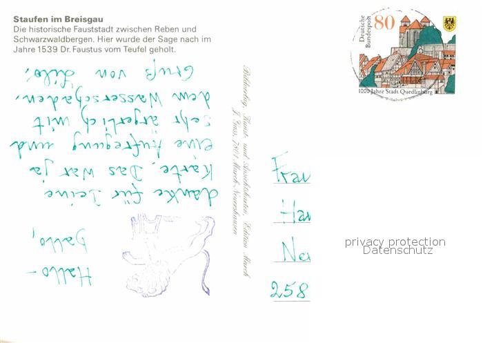 72692782 alte Postkarte Staufen Breisgau Historische Fauststadt Altstadt Burg Blick ins Rheintal postalisch gelaufen Erhaltung siehe scans [FriedD77] KatCode: 11110008315108