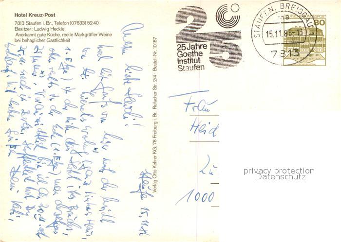 73726316 alte Postkarte Staufen Breisgau Hotel Kreuz Post Zunftstube Stadtsee Burgruine Panorama Schwarzwald Postkutsche postalisch gelaufen Erhaltung siehe scans [FriedD77] KatCode: 11110008315108