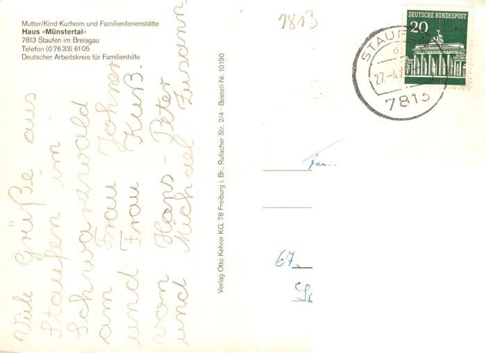 73929850 alte Postkarte Staufen Breisgau Kurheim Haus Muenstertal Liegeterrasse Burgstube Clubraum Marktplatz Burgruine Appartementwohnung postalisch gelaufen Erhaltung siehe scans [FriedD77] KatCode: 11110008315108