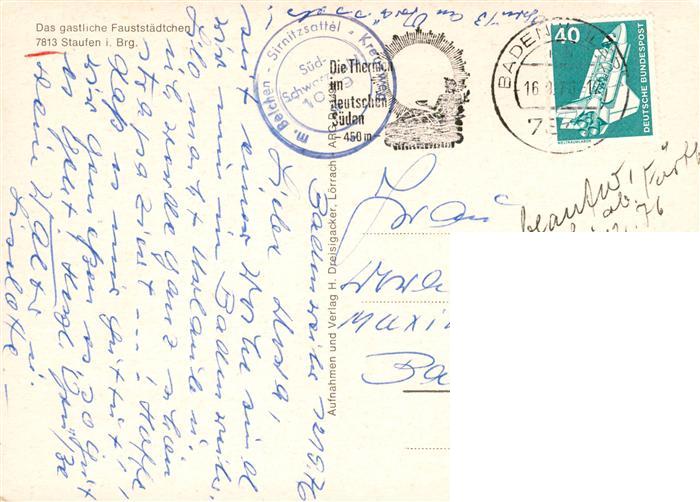73934908 alte Postkarte Staufen Breisgau Marktplatz Feuerwerk Kurhaus Panorama Burgruine Schwimmbad Hauptstrasse Camping postalisch gelaufen Erhaltung siehe scans [WerneD78] KatCode: 11110008315108