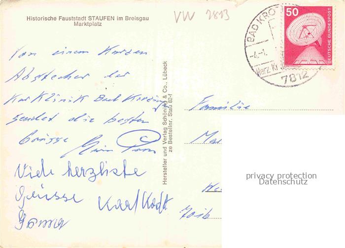 74104186 Staufen Breisgau Marktplatz Historische Fauststadt postalisch gelaufen Erhaltung siehe scans [FriedD77] alte Postkarte Frie Katcode 11110008315108
