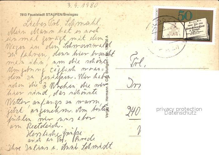 alte Postkarte Staufen Breisgau Panorama Fauststadt mit Burg postalisch gelaufen Erhaltung siehe scans