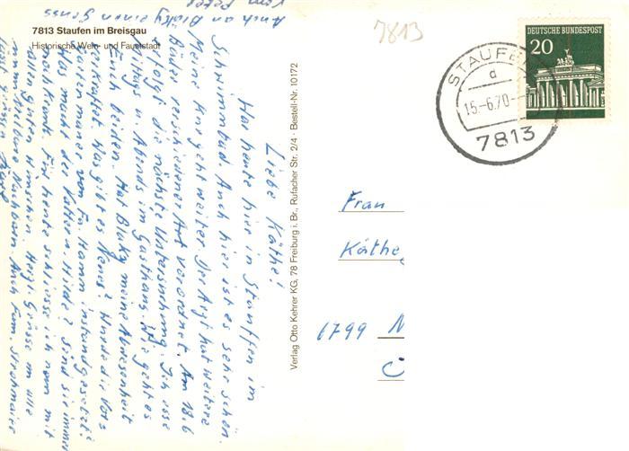 73929854 alte Postkarte Staufen Breisgau Stadtsee Burgruine Panorama Hauptstrasse Camping Belchenblick Marktplatz Staedt Schwimmbad postalisch gelaufen Erhaltung siehe scans [FriedD77] KatCode: 11110008315108