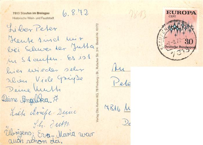 73929836 alte Postkarte Staufen Breisgau Stadtsee mit Burgruine Panorama Hauptstrasse Camping Belchenblick Marktplatz Staedt Schwimmbad postalisch gelaufen Erhaltung siehe scans [FriedD77] KatCode: 11110008315108