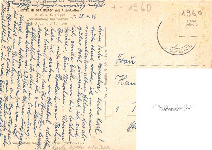 72909217 alte Postkarte Staufenberg Hessen Hotel in der Burg Ritterkeller postalisch gelaufen Erhaltung siehe scans [NatalD47] KatCode: 11110006531017