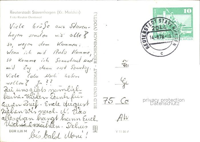 72136483 alte Postkarte Stavenhagen Reuterstadt Fritz Reuter Denkmal postalisch gelaufen Erhaltung siehe scans KatCode: 11110013052074