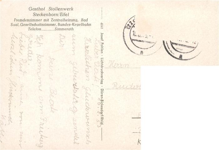 73878707 alte Postkarte Steckenborn Simmerath Gasthof Stollenwerk Kirche Panorama Schwammenauel postalisch gelaufen Erhaltung siehe scans [FriedD77] KatCode: 11110005354028