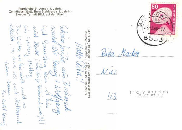 72730589 alte Postkarte Steeg Bacharach Pfarrkirche Sankt Anna Zehnthaus postalisch gelaufen Erhaltung siehe scans [AndreD76] KatCode: 11110007339003
