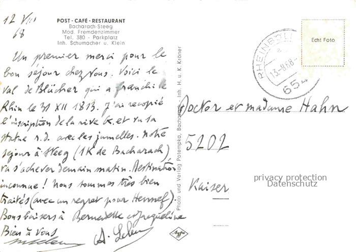74106414 alte Postkarte Steeg Bacharach Rheinland-Pfalz Post-Café Restaurant Landschaftspanorama postalisch gelaufen Erhaltung siehe scans [FriedD77] KatCode: 11110007339003