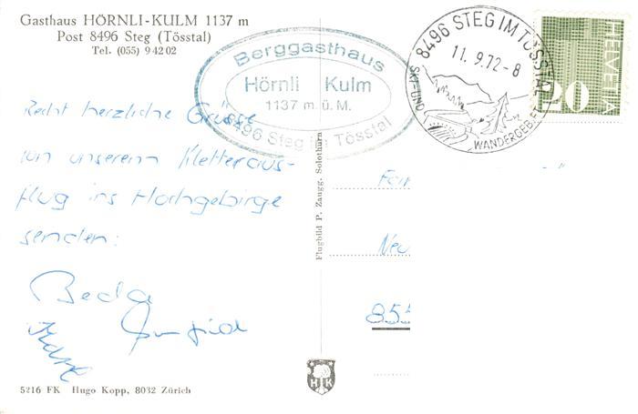 13926425 alte Postkarte Steg Toesstal ZH Gasthaus Hoernli Kulm mit Vorarlbergeralpen und Saentis postalisch gelaufen Fliegeraufnahme Erhaltung siehe scans [WerneD78] KatCode: 11470260885280