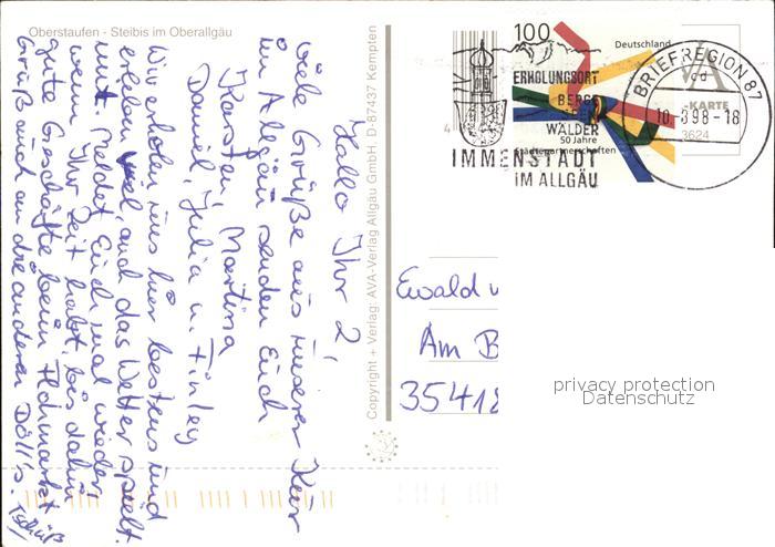 72391849 alte Postkarte Steibis Oberstaufen Bayern Wasserfall Hochgratbahn postalisch gelaufen Erhaltung siehe scans KatCode: 11110009780132