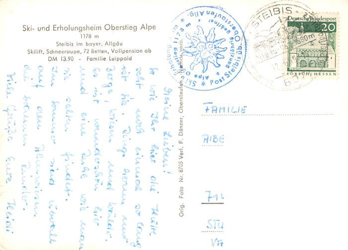 73904107 Steibis Oberstaufen Ski und Erholungsheim Oberstieg Alpe postalisch gelaufen Erhaltung siehe scans [WerneD78] alte Postkarte Wern Katcode 11110009780132